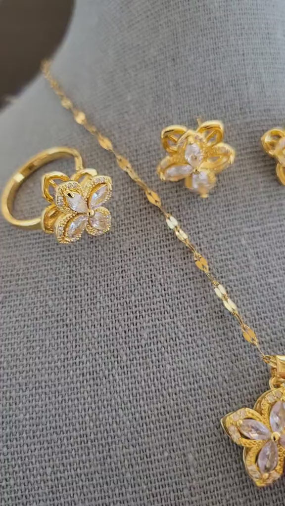 Cada pieza —collar, anillo y aretes— está elaborada con una delicada flor de cuatro pétalos, símbolo de belleza, armonía y buena energía.
